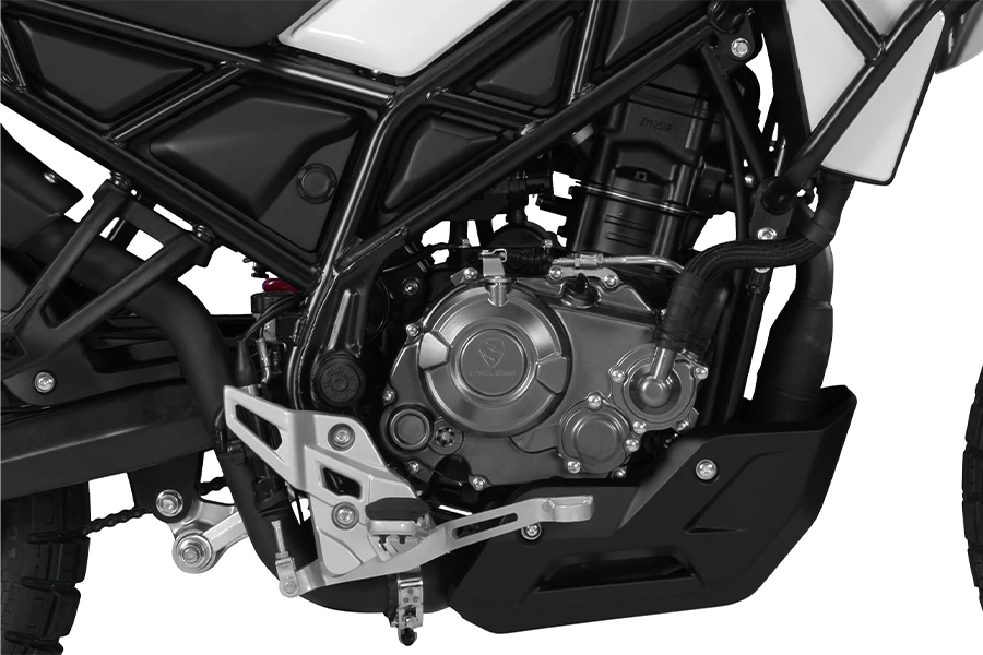 Motor 125 cc líquido de 15 CV, suspensões de longo curso, pneus offroad e proteção completa (motor, crashbars e forquilha) para qualquer terreno. Equipada com guarda-lamas frontal baixo, é possível alterar para guarda-lamas alto (opcional).